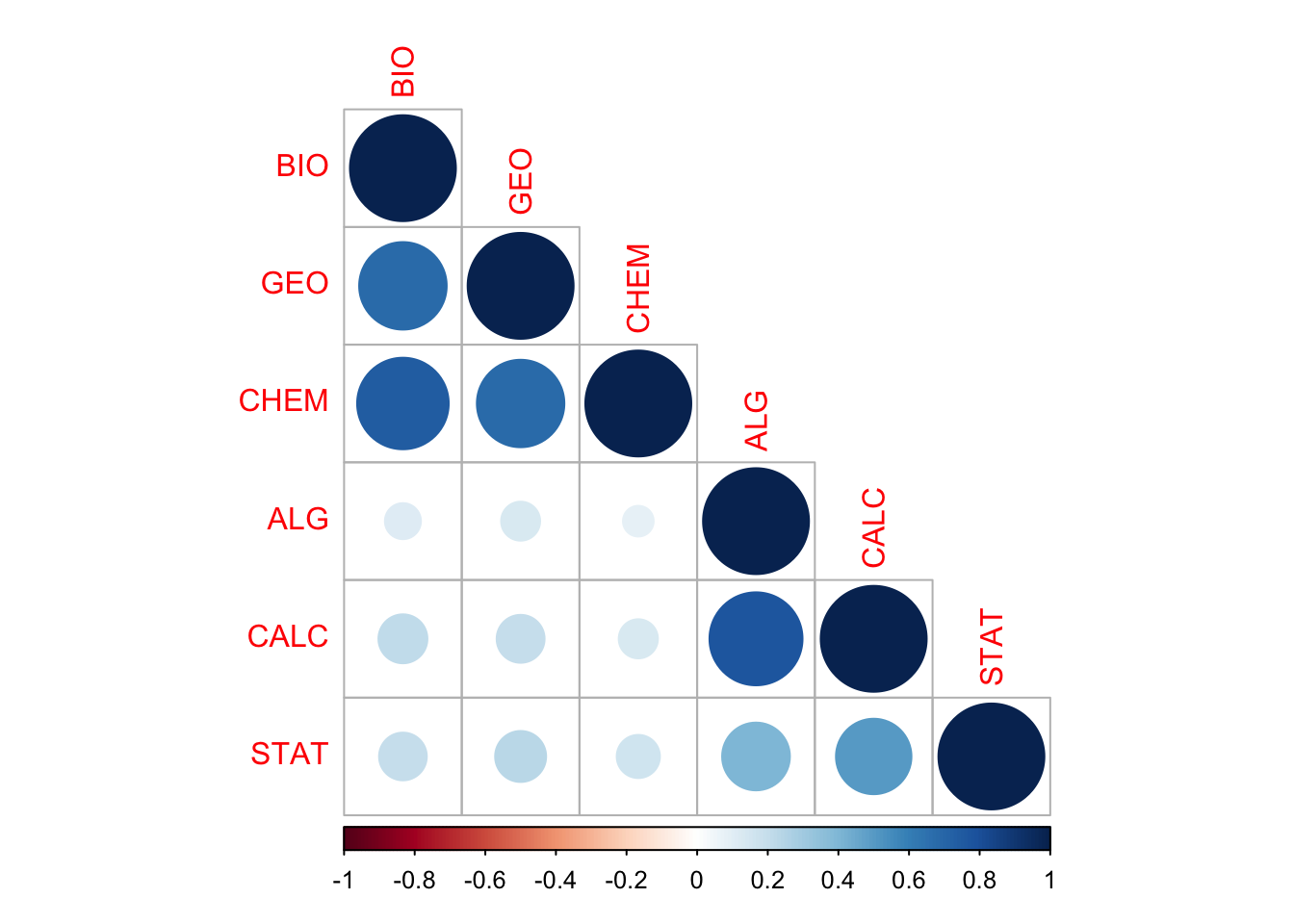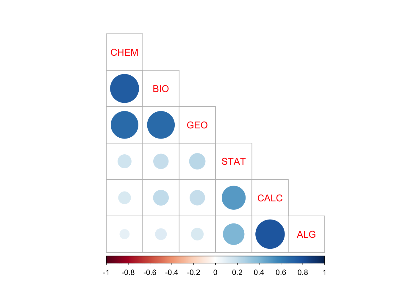 tab_corr(data, triangle = "lower")| BIO | GEO | CHEM | ALG | CALC | STAT | |